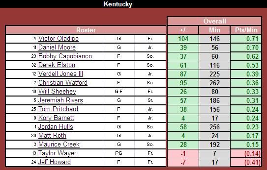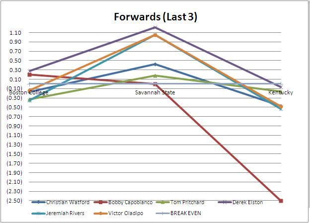 Overall you see everyone's numbers fell. It's still important to note that as long as the player is in the Positive (Green) he's doing a great job for the team. As the Losses start coming more frequently (hopefully not) it will be important to remember that.