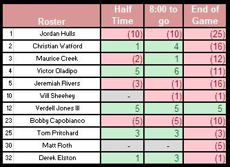 1. I was SHOCKED to see Hulls at -25 for the game. I figured he wouldn't do as well going up against top flight athletes, but I didn't foresee him going -25 in a game we only lost by 19.