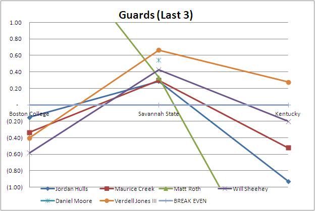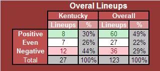 As you can see, Crean used 22 different lineups amongst his 27 total lineups. For the game, only 15 were positive or neutral. The higher percentage of lineups used went negative which, similar to BC, resulted in a loss. For the year CTC has 123 different combinations of players with 50% of those being positive. I'd consider that good coaching, or a weak schedule lol!