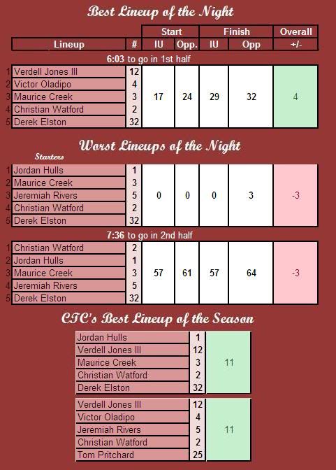 Looking at this game from the box score doesn't quite give it justice. I had a conversation with a Purdue fan about the game I thought I'd share. He said he was surprised that our team kept coming back after the 6-0 and 8-0 spurts by Kentucky. He was impressed that Crean had seemed to coach these guys well and had them in a position to win the game if their shots were going down. Also said he wouldn't be surprised to see IU knock off some top tier teams in the Big Ten if they can get more production from the front line. Finally, the Big Statement "IU could cause my Boilers trouble... I'm thinking we don't take both this year."